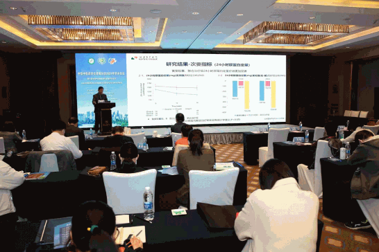 在主会场现场,由中华中医药学会肾病分会主任委员杨洪涛教授主持,中华中医药学会肾病分会名誉副主任委员、江苏省中医院首席科学家孙伟教授发布了《黄葵胶囊治疗2型糖尿病肾脏疾病(DKD)的随机、双盲、平行对照、多中心临床试验》的最新成果–黄葵胶囊与厄贝沙坦疗效相当且更具优势,且黄葵胶囊与厄贝沙坦合并用药疗效更加显著!该项目以一线推荐用药厄贝沙坦作为对照药,以T2DKD患者的尿白蛋白/肌酐比值、24小时尿蛋白等指标为疗效指标,观察期24周。纳入患者413例,分黄葵胶囊组、厄贝沙坦组和黄葵胶囊联合厄贝沙坦组三组。研究结果显示,黄葵胶囊组尿蛋白下降的结果比厄贝沙坦组更明显,黄葵胶囊联合厄贝沙坦组下降结果最为明显。孙伟教授表示取得这样研究结果,增强了对中医药研究和发展的信心和力量!